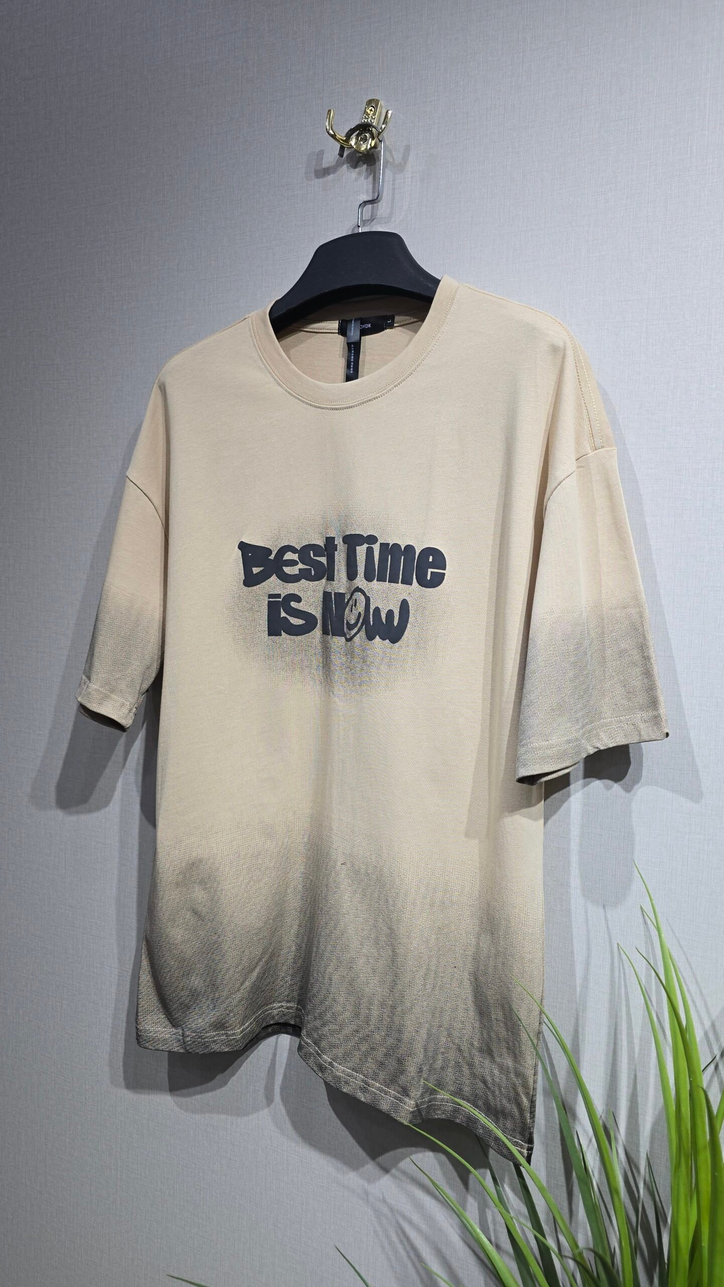 تيشيرت بتصميم مغسول يعطيه لمسة شبابية مميزة، مزوّد بعبارة BEST TIME IS NOW اللي تضيف روح إيجابية وتعطيه حضور أقوى في إطلالتك اليومية. قصّة مريحة وتفاصيل بسيطة لكنها ملفتة، يخليك تلبسه بثقة في الطلعات والكاجوال والاستايلات اليومية.
