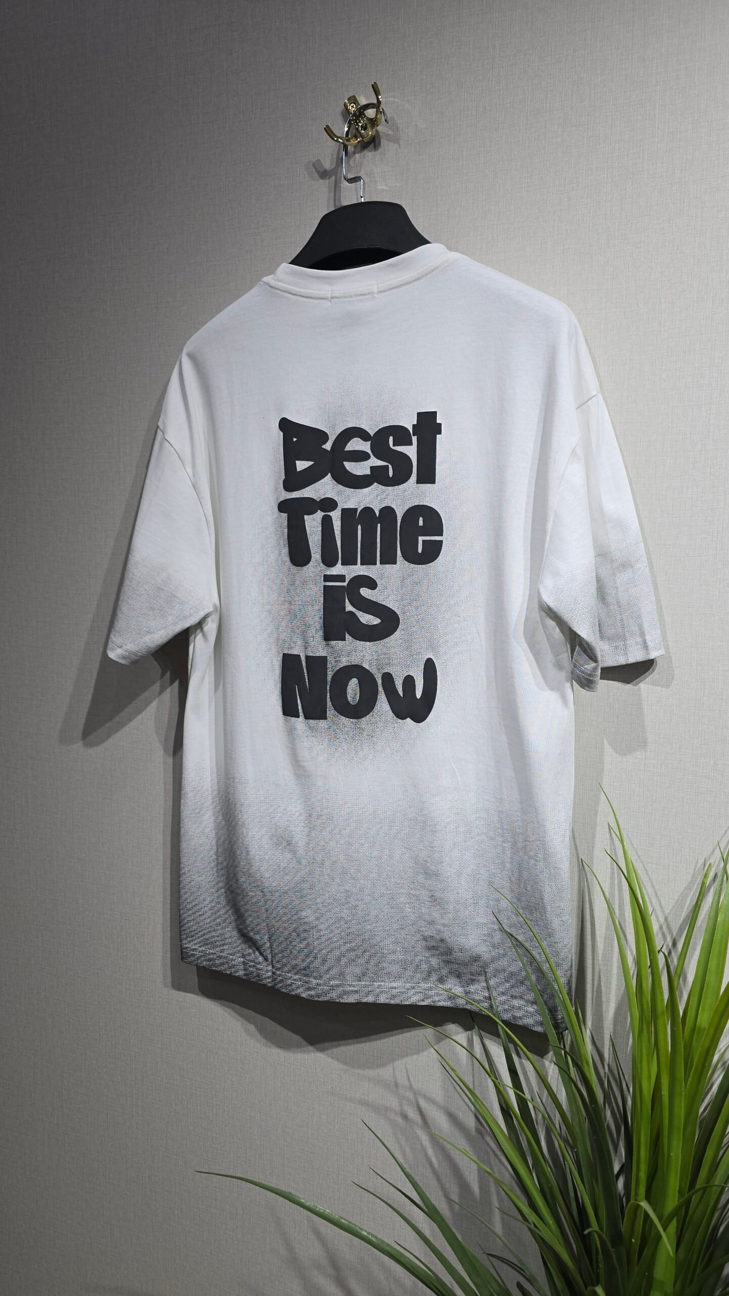 تيشيرت بتصميم مغسول يعطيه لمسة شبابية مميزة، مزوّد بعبارة BEST TIME IS NOW اللي تضيف روح إيجابية وتعطيه حضور أقوى في إطلالتك اليومية. قصّة مريحة وتفاصيل بسيطة لكنها ملفتة، يخليك تلبسه بثقة في الطلعات والكاجوال والاستايلات اليومية.