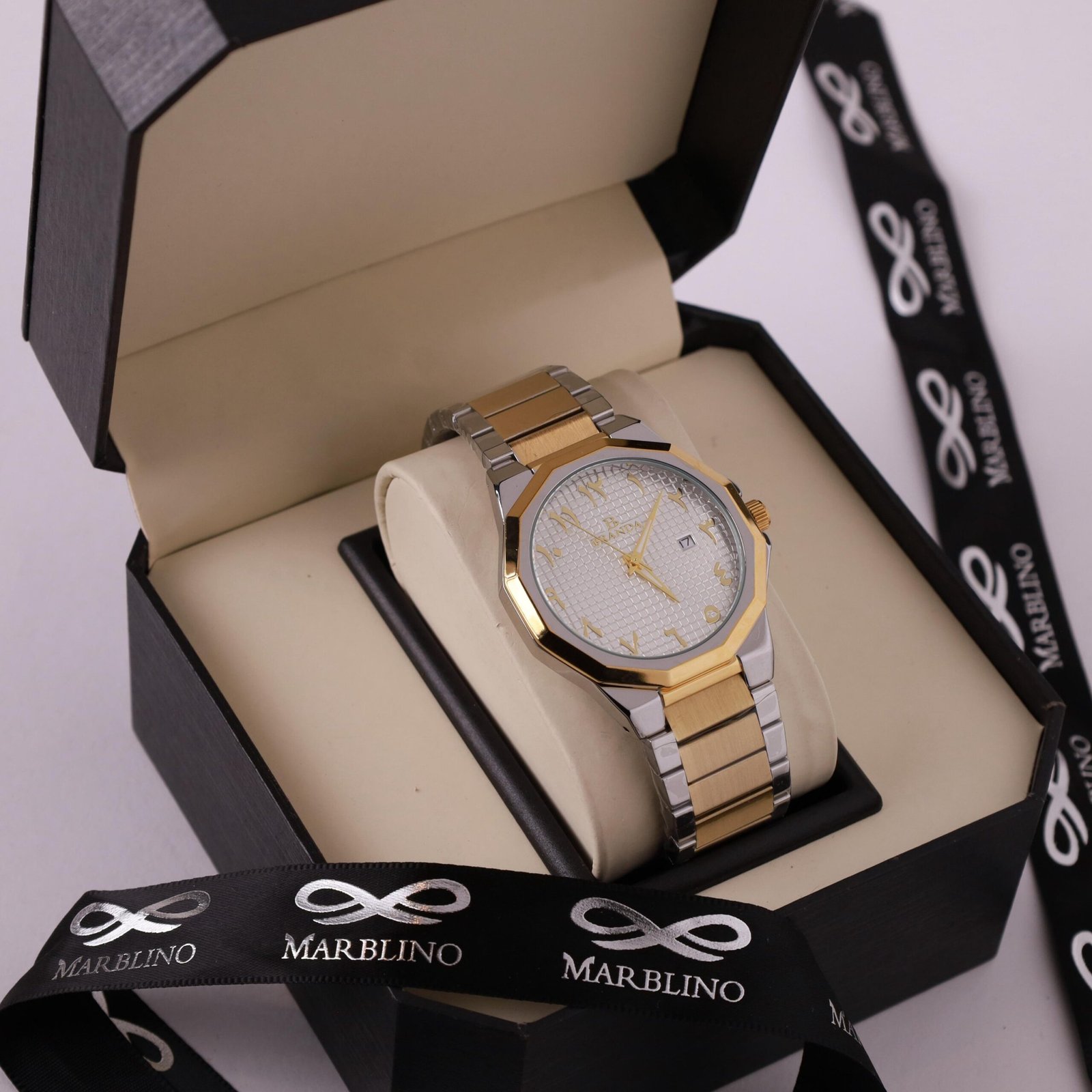 العلامة التجارية: يظهر شريط حول العلبة يحمل اسم العلامة التجارية “MARBLINO” مع رمز اللانهاية (∞) فوق الاسم، مما يشير إلى أن الساعة هي من إنتاج هذه الماركة.